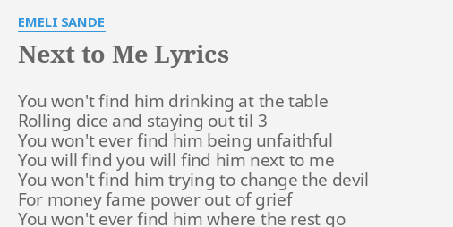 Next to Me is a choir-backed soulful track that sees Emeli Sandé insists on her mans loyalty. And I cant seem to find no help or love for free. Ad Tickets On Sale Today Secure Your Seats Now International Tickets 2022.